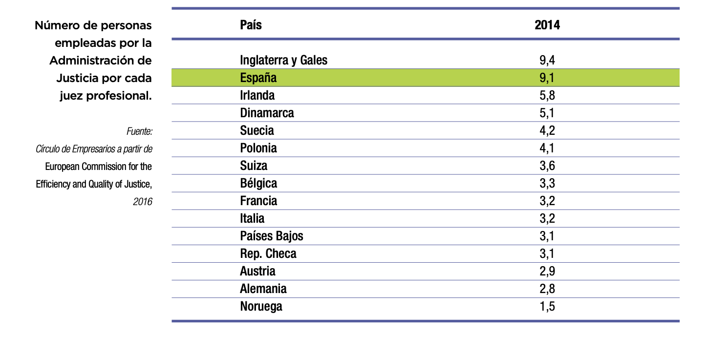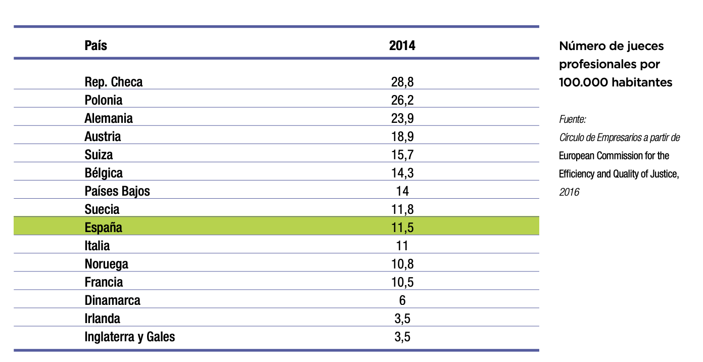 El estudio del Círculo de Empresarios se fija también en los recursos que emplean los distintos países europeos para financiar sus sistemas judiciales. Los fondos asignados a los tribunales ascienden en España al 0,67% del gasto público, un porcentaje similar al de Países Bajos. Nos situamos en la zona media-baja del ranking, pero cerca de algunos países cuyos sistemas de Justicia funcionan claramente mejor que el nuestro.