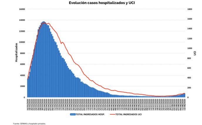 En cuarto lugar, cabe comparar los gráficos de positivos con los de hospitalizados para visualizar mejor el escenario epidemiológico que enfrenta la CAM. Si hacemos ese ejercicio podemos ver que el número de diagnósticos por covid-19 sí muestra un crecimiento digno de reseñar, lo que refleja un repunte de casos pero también tiene que ver con la capacidad de rastreo, que era muy baja en marzo pero es mucho mayor en agosto. Al mismo tiempo, esta comparativa revela que las hospitalizaciones se mantienen en niveles ínfimos comparados con marzo-abril, de manera que los "rebrotes" no están teniendo, afortunadamente, una gravedad comparable a la de entonces.