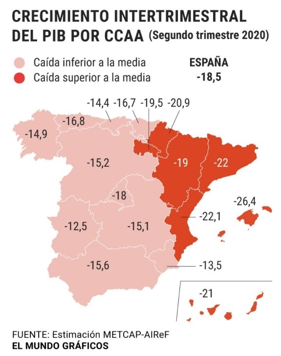 - Según la AIReF regiones como Baleares, Cataluña (19% del PIB español) y Canarias podrían haber caído un 26,4, 22 y 21%, respectivamente.