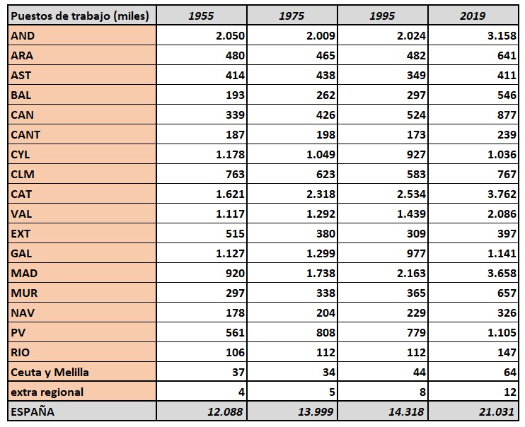 Por ejemplo, Madrid tenía en 1955 menos de la mitad de puestos de trabajo que Andalucía: hoy tiene un 15% más.