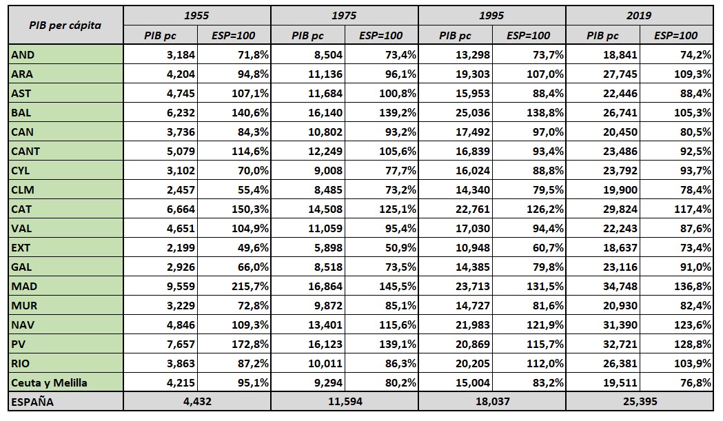 Varios aspectos llaman la atención. En primer lugar, la enorme diferencia que existía en 1950 entre las regiones españolas. Tres de ellas (Cataluña, País Vasco y Madrid) tenían un PIB pc superior en un 50% a la media nacional. El PIB pc en Madrid era más del doble de la media (un desequilibrio llamativo, incluso asumiendo una cierta distorsión por el efecto capitalidad, que quizás sumaba rentas generadas en otras zonas). Madrid tenía un PIB pc cuatro veces superior al de Castilla-La Mancha o Extremadura, por ejemplo.