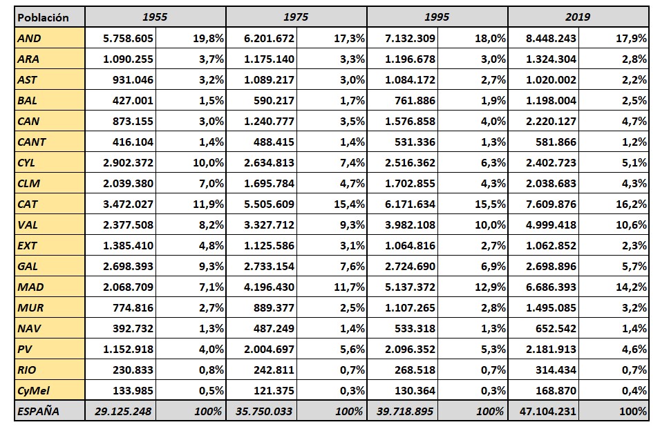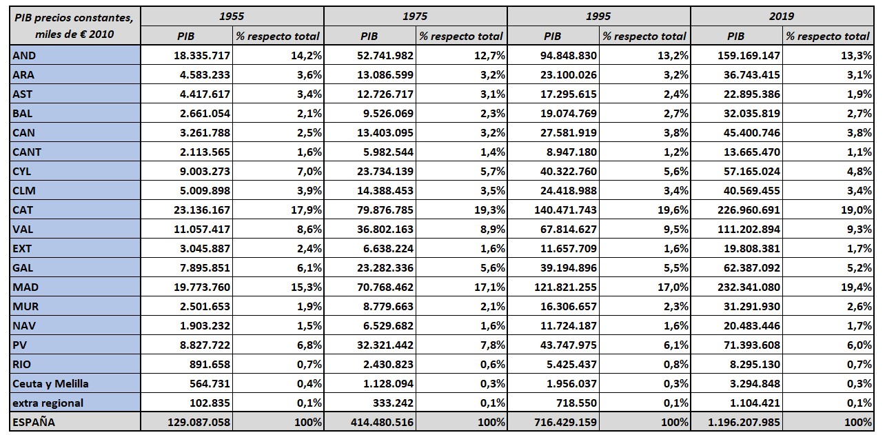 Hay tantas cifras que es fácil perderse o sentirse abrumado. Para este artículo hemos optado por destacar cuatro tablas con el PIB, el PIB per cápita, los puestos de trabajo y la población en las 17 comunidades autónomas españolas entre 1955 y 2019 (incluimos también los datos de 1975 y 1995). Nada de lo que nos dicen esas cifras es nuevo, pero sí aparecen detalles interesantes.