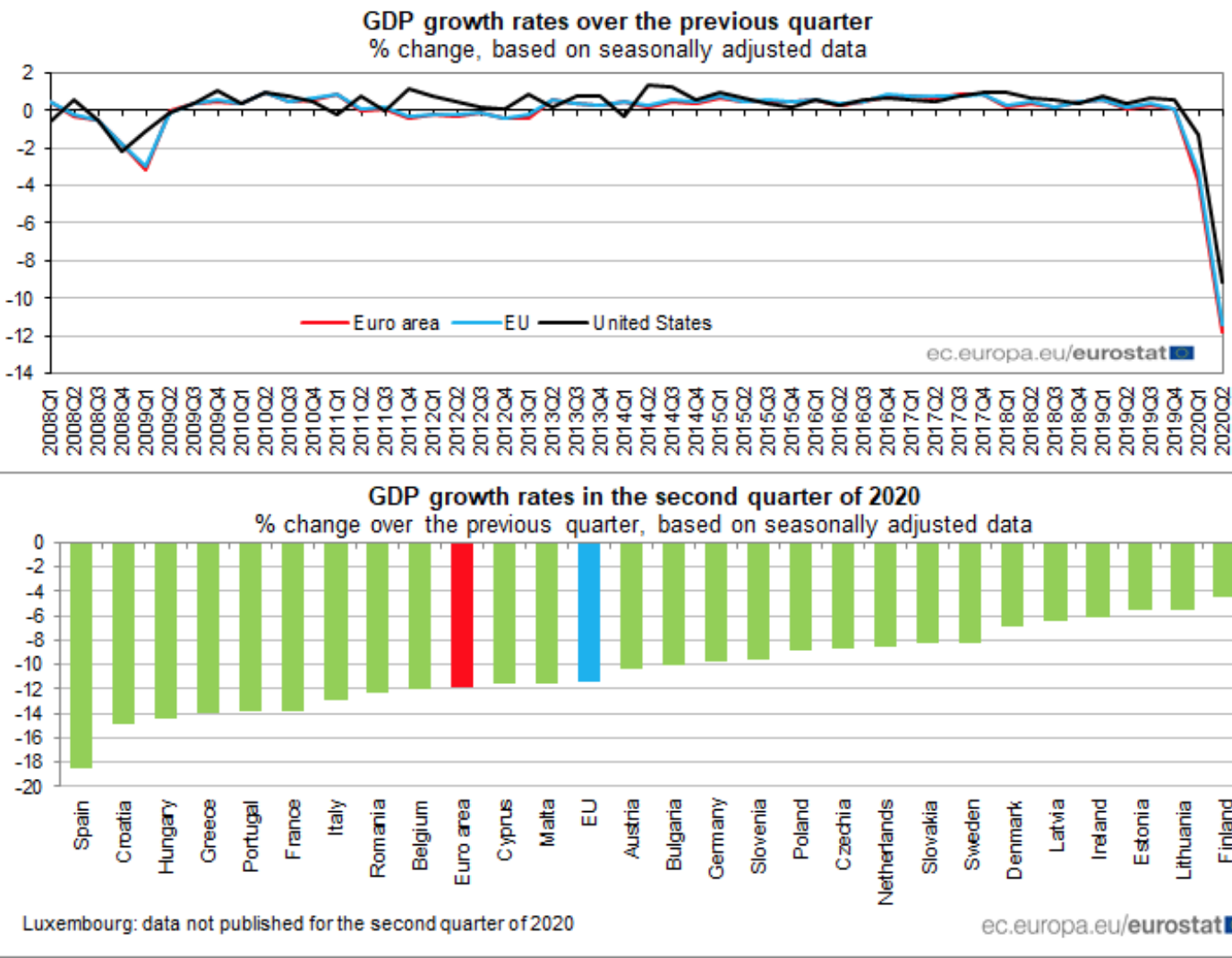 En los primeros tres meses de 2020, la economía se había contraído un 3,7% en los diecinueve países que comparten la moneda única y un 3,3% en el conjunto del club comunitario. Si se realiza la comparación interanual, el PIB cayó un 14,7 % en el área del euro y un 13,9% en la UE entre abril y junio de 2020 con respecto al mismo periodo del año anterior. En el primer trimestre, los descensos habían sido del 3,2% y del 2,7%, respectivamente.