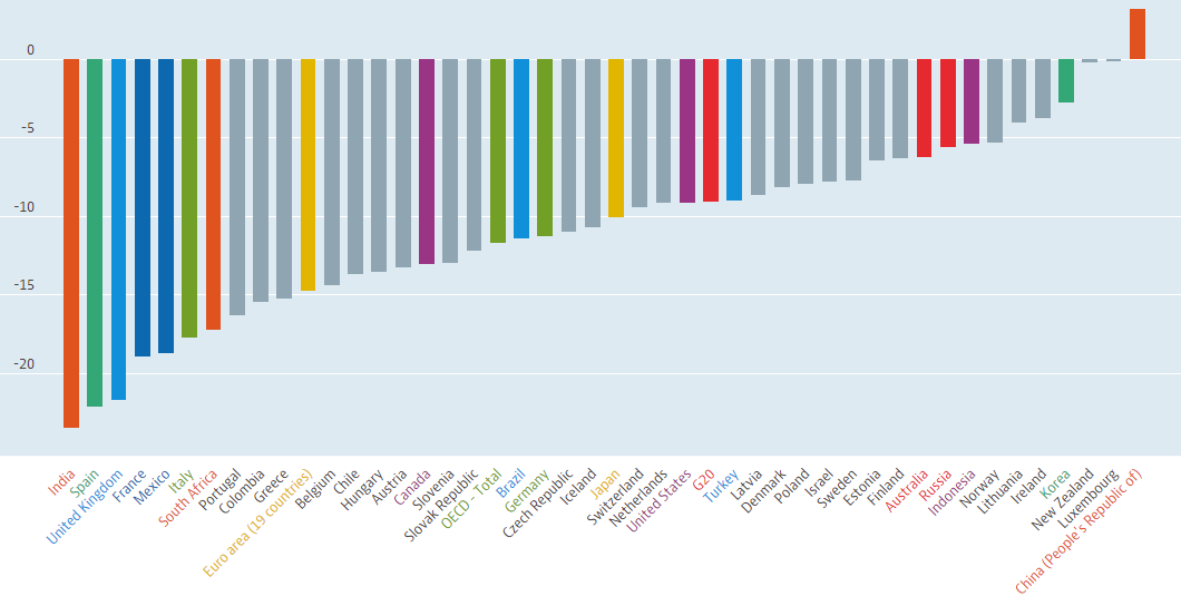 España registró en el segundo trimestre la mayor caída del PIB de la treintena de países ricos que componen la OCDE, con más de un 22% interanual, tan sólo superado por India.