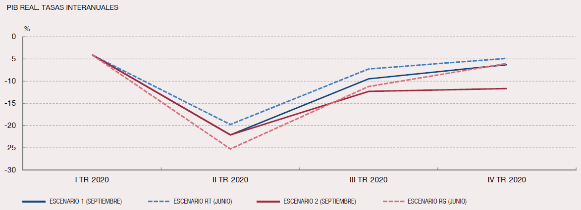No es el único. El Banco de España también ha empeorado sus previsiones, tras descartar un "escenario de recuperación temprana" en el tercer y cuarto trimestre. Ahora, se decanta por una caída de entre el 10,5% y el 12,6% en el conjunto del año, por encima incluso de los peores escenarios elaborados en junio (-11,6%).