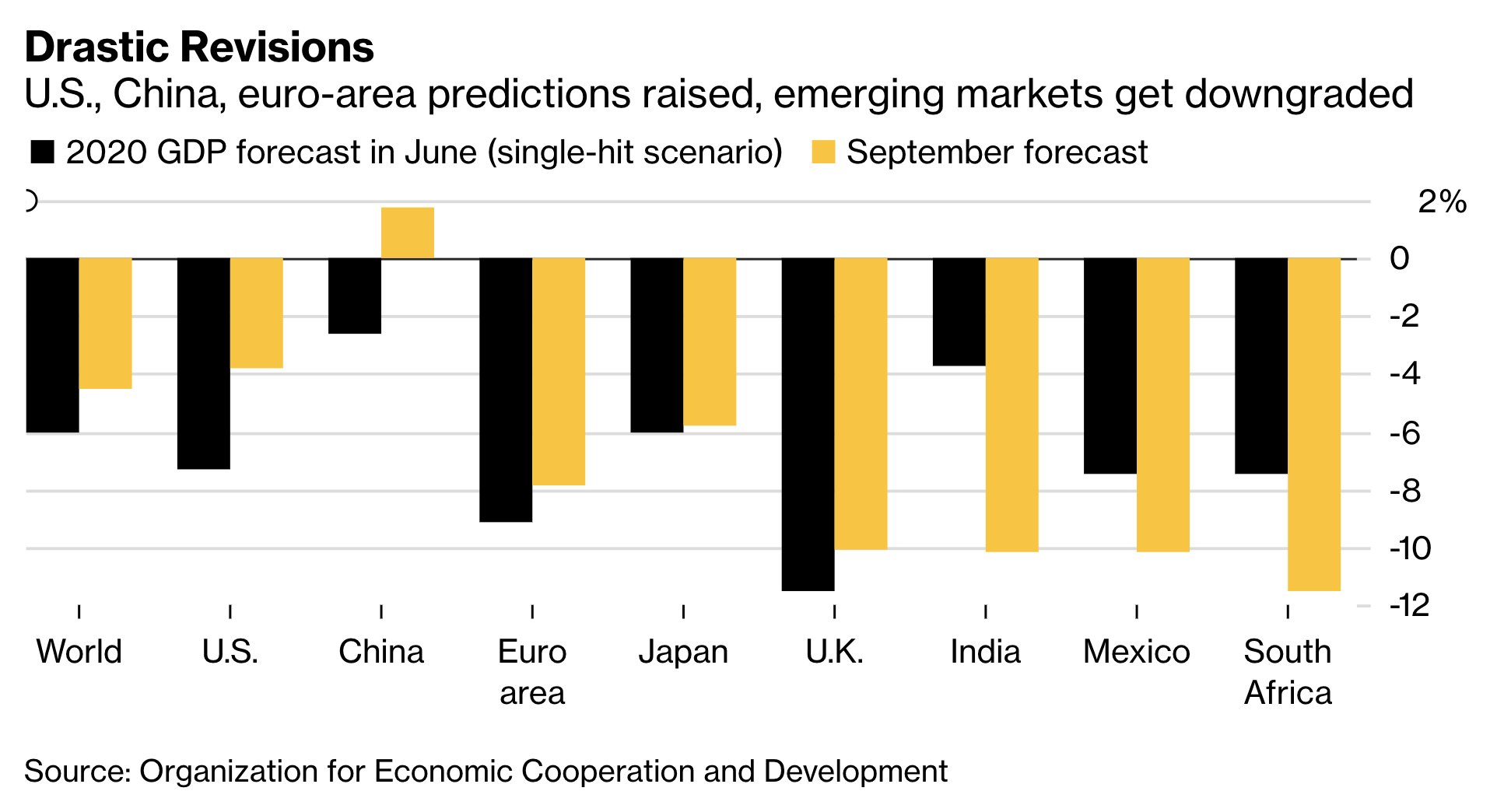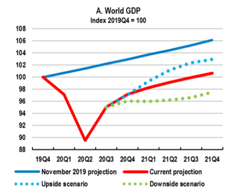 potencias. Los últimos datos de la OCDE, publicados el pasado miércoles, confirman que España se ha descolgado de la recuperación global. Aunque la incertidumbre sigue siendo muy elevada y, de hecho, augura un crecimiento algo menor el próximo año, con un avance del PIB mundial del 5% frente al 5,2% previsto hace tres meses, el escenario central que calcula ahora este organismo consiste en una recesión global del 4,5% (línea roja del gráfico), frente al 6% estimado en junio.