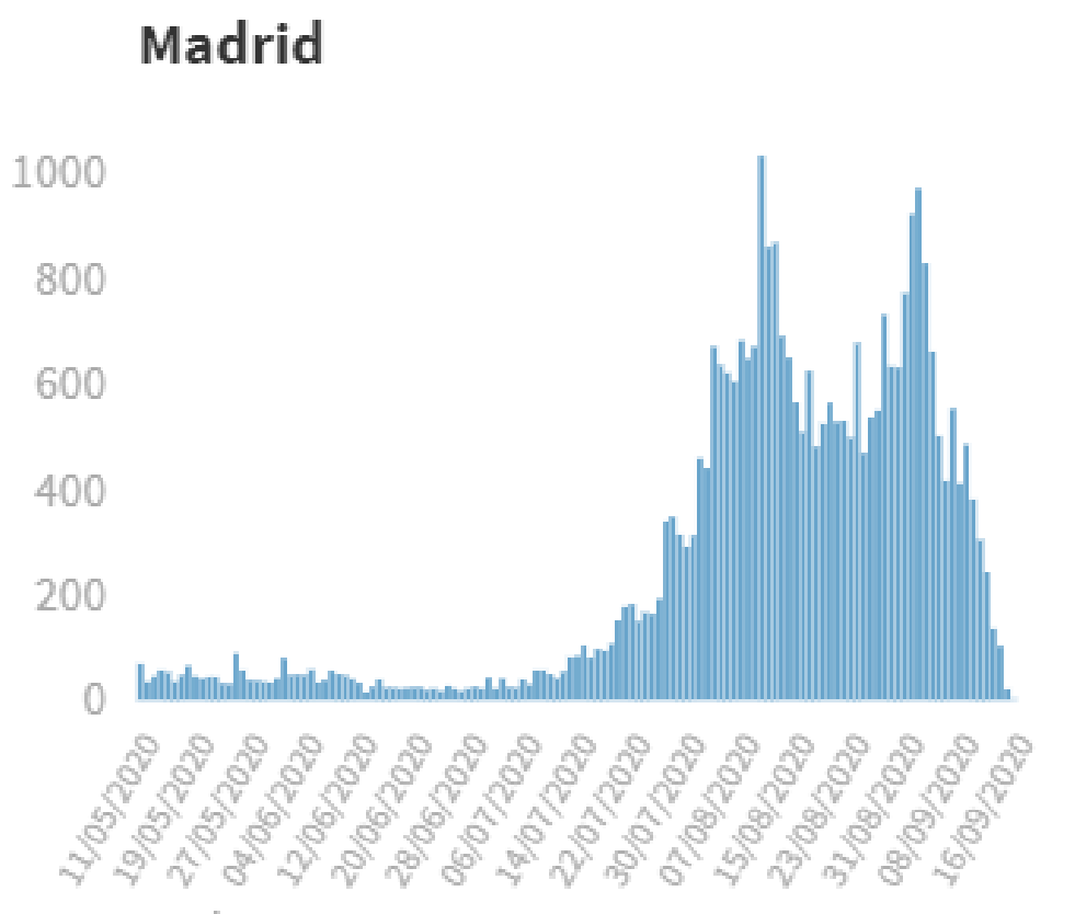 Es importante, no obstante, contrastar el gráfico de positivos por fecha de diagnóstico con el gráfico de positivos por fecha de inicio de síntomas, puesto que el segundo muestra que la mayoría de los contagios que ahora salen a la luz se habría producido entre finales de agosto y comienzos de septiembre, precisamente cuando muchos de los residentes de Madrid estaban en otras regiones y, por lo tanto, sujetos a la gestión sanitaria de otras autoridades (regionales o nacionales).
