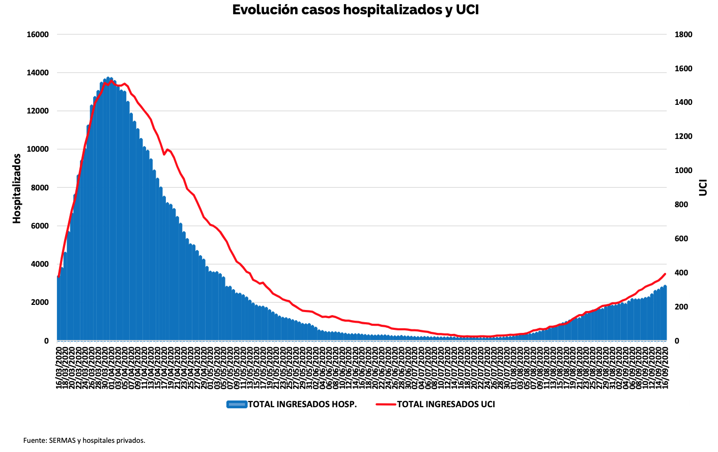 En febrero, cuando la covid-19 empezó a circular por España, la Comunidad de Madrid contaba con 600 unidades de cuidados intensivos (UCI) y sumaba 14.000 camas de hospital. Sin embargo, seis meses después vemos que estas cifras han crecido y, a mediados de septiembre, hay operativas unas 940 UCI y 16.800 camas. No obstante, los planes de elasticidad de la CAM pueden elevar más aún estas cifras, para llegar hasta 1.900 UCI y 24.000 camas en cuestión de unos pocos días. Hay que tener en cuenta, además, que el crecimiento de las hospitalizaciones no está siendo exponencial, como puede verse en el siguiente gráfico al comparar la primera con la segunda ola de contagios, de modo que el margen de maniobra es mayor.