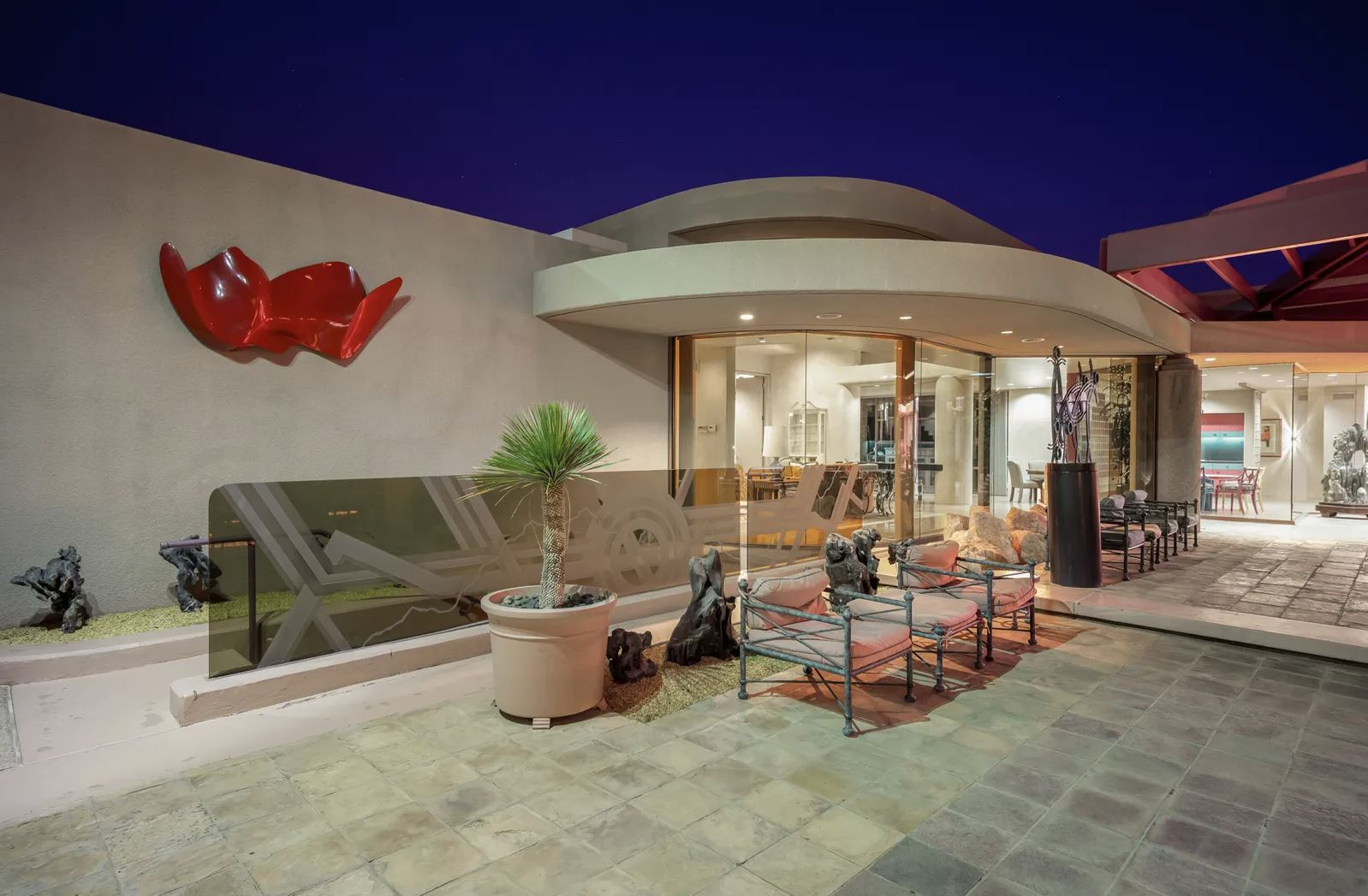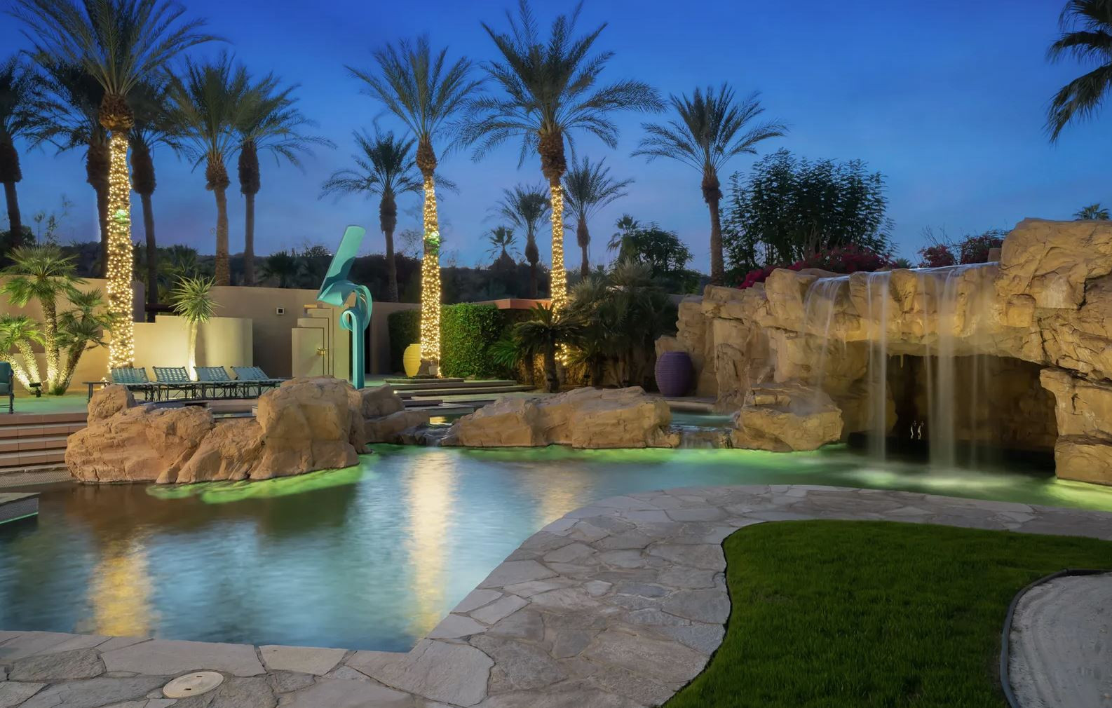 Esta propiedad espectacular situada en una urbanización de casas ofrece vistas panorámicas de las cascadas en su patio, con una enorme piscina.