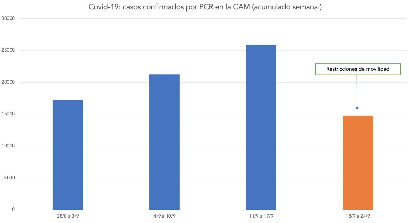 El acumulado semanal de casos de PCR confirmados en la Comunidad de Madrid ha experimentado un descenso en los últimos siete días con datos disponibles. Del 28 de agosto al 3 de septiembre se constataron 17.219 contagios, mientras que del 4 al 10 de septiembre se registraron 21.264 y del 11 al 17 de septiembre se dieron 25.884 positivos. Sin embargo, el acumulado de casos confirmados entre el 18 al 24 de septiembre asciende a 14.766, un 43% menos que entre el 11 y el 17 de septiembre, un 31% por debajo de los números del 4 al 10 de septiembre y un 14% por debajo de las cifras del 28 de agosto al 3 de septiembre. Y todo ello a pesar de que el número de test realizados cada semana ha subido de 120.000 a 150.000 a lo largo de las tres primeras semanas de septiembre.