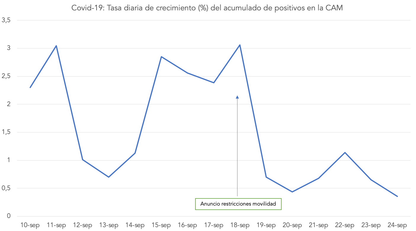 Si nos fijamos en la tasa de crecimiento que arroja el acumulado de positivos, también podemos ver una ralentización progresiva. Si entre el 10 y el 18 de septiembre dicho indicador subió a tasas comprendidas entre el 1% y el 3%, los datos de la última semana se han situado por debajo del 1%, siendo la tasa del 24 de septiembre (último día con cifras disponibles) del 0,4%.