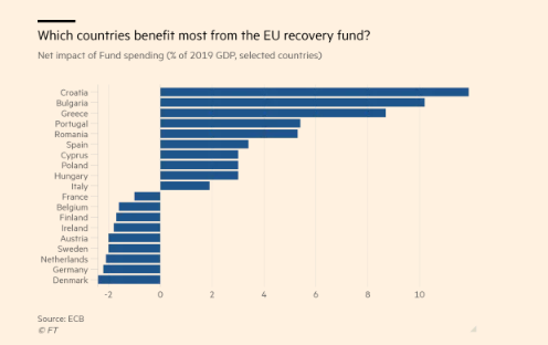 Esto, de por sí, supone una amenaza para la Eurozona. Pero, además, evaluando las propias cifras que da el BCE acerca del reparto de los 390.000 millones de euros de subvenciones a fondo perdido en términos netos (esto es, descontando las aportaciones de los Estados Miembros a la UE en el marco del nuevo presupuesto) hay unos claros ganadores y también perdedores en este intercambio de recursos.