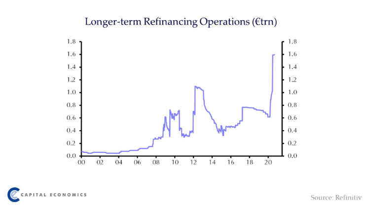 La petición de Lagarde, además, se produce en un entorno en el que la Unión Europea sufre una clara desaceleración de una recuperación que ya era de por sí débil, a pesar de que el BCE está ejecutando el mayor programa de compras de su historia, tanto a través de TLTROs (ya está en los 1,6 billones de euros) como a través de los distintos programas de compra de bonos soberanos y corporativos.