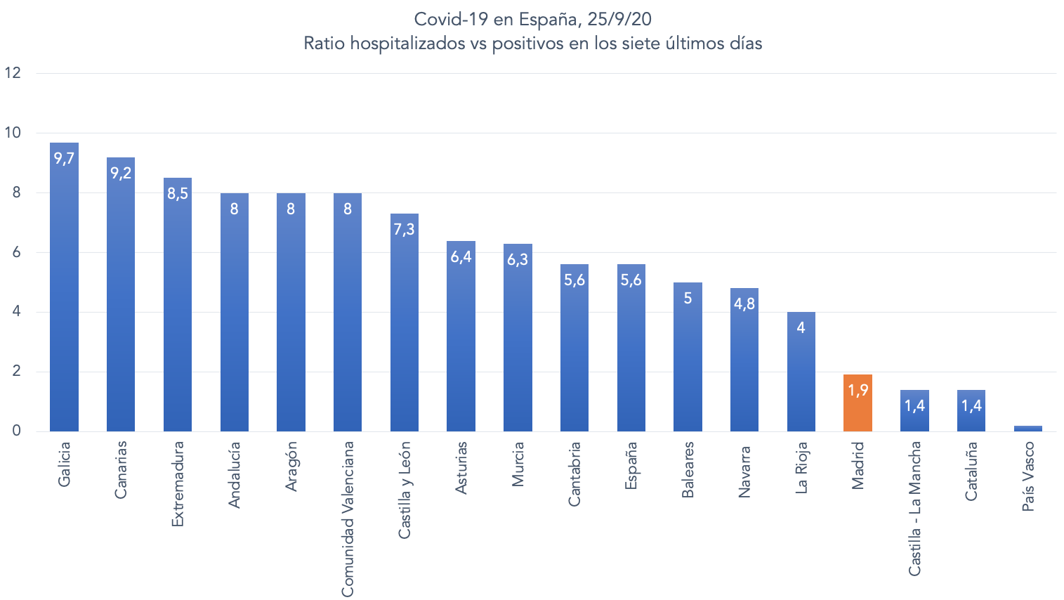 De igual manera, otro factor relevante para analizar la incidencia del covid-19 en cada territorio pasa por comparar el número de positivos con el de hospitalizados. El ministerio de Sanidad ofrece ambas cifras, pero no las relaciona entre sí. No obstante, si hacemos este cálculo con los datos de los siete últimos días podemos ver que Madrid es la cuarta comunidad con menor ratio de hospitalizados vs positivos. De hecho, si el promedio nacional es de 5,6%, el cociente de Madrid es de un 1,9%.