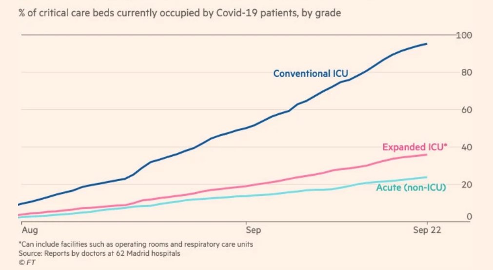 Pero, en cualquier caso, hay miedo a que la acumulación de ingresos termine por desbordar el sistema. ¿Puede volver a ocurrir eso? El siguiente gráfico, publicado por el Financial Times, muestra que las UCI del sistema de salud madrileño se habrían desbordado en circunstancias normales al llegar a los niveles actuales de ingresos por coronavirus (línea azul). Sin embargo, gracias a los planes de elasticidad, la ocupación de las UCI por parte de pacientes de covid-19 no llega al 40% (línea rosa). De igual manera, la ocupación de camas de hospital por parte de enfermos del patógeno originario de China está ligeramente por encima del 20 (línea celeste).
