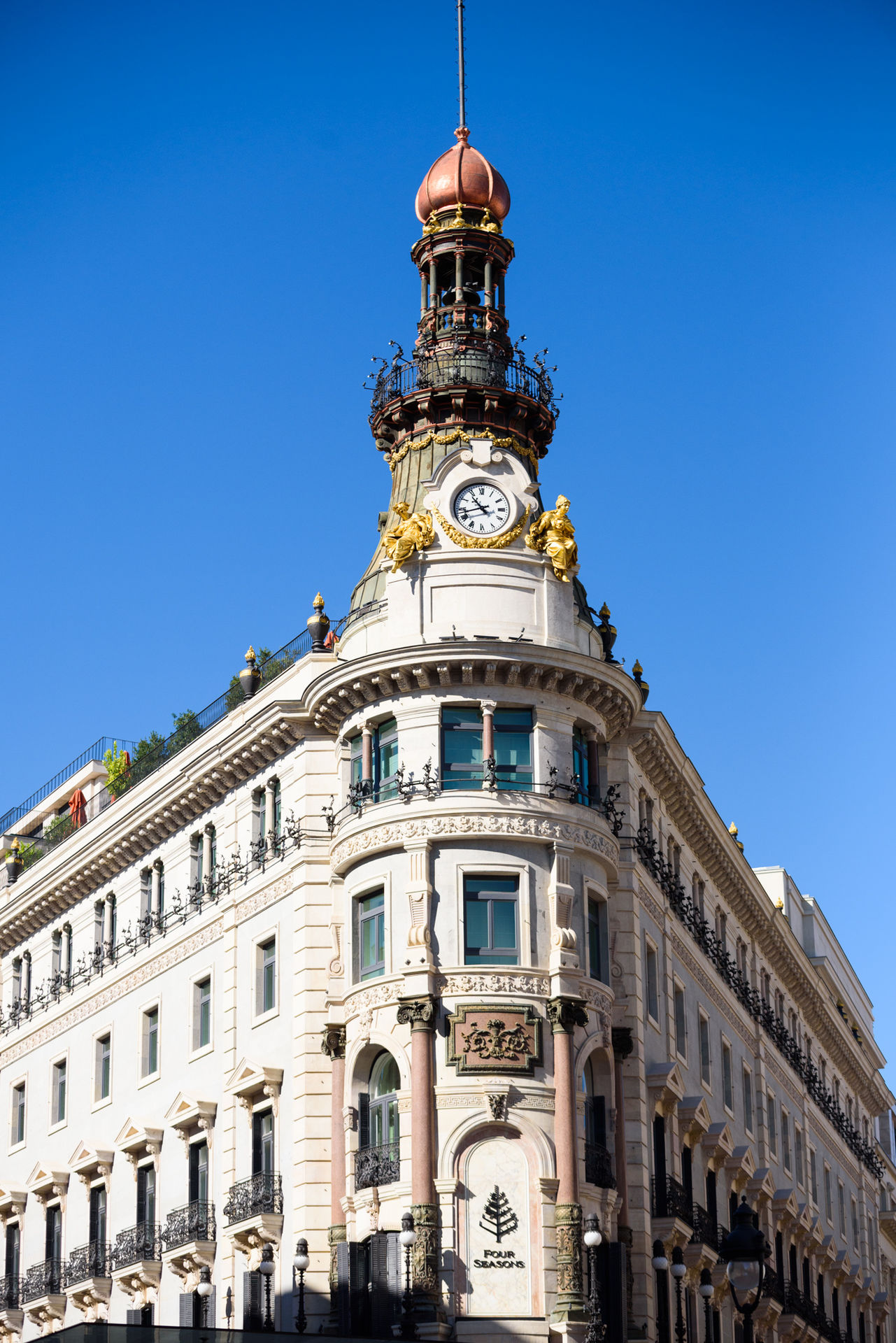 El hotel Four Seasons se encuentra ubicado en pleno centro histórico Madrid; en la que fue la manzana 265 de la capital española. Comprende un conjunto de 7 excepcionales edificios, de gran valor histórico y arquitectónico ubicados entre la Carrera de San Jerónimo, la plaza de Canalejas y las calles de Sevilla y Alcalá.