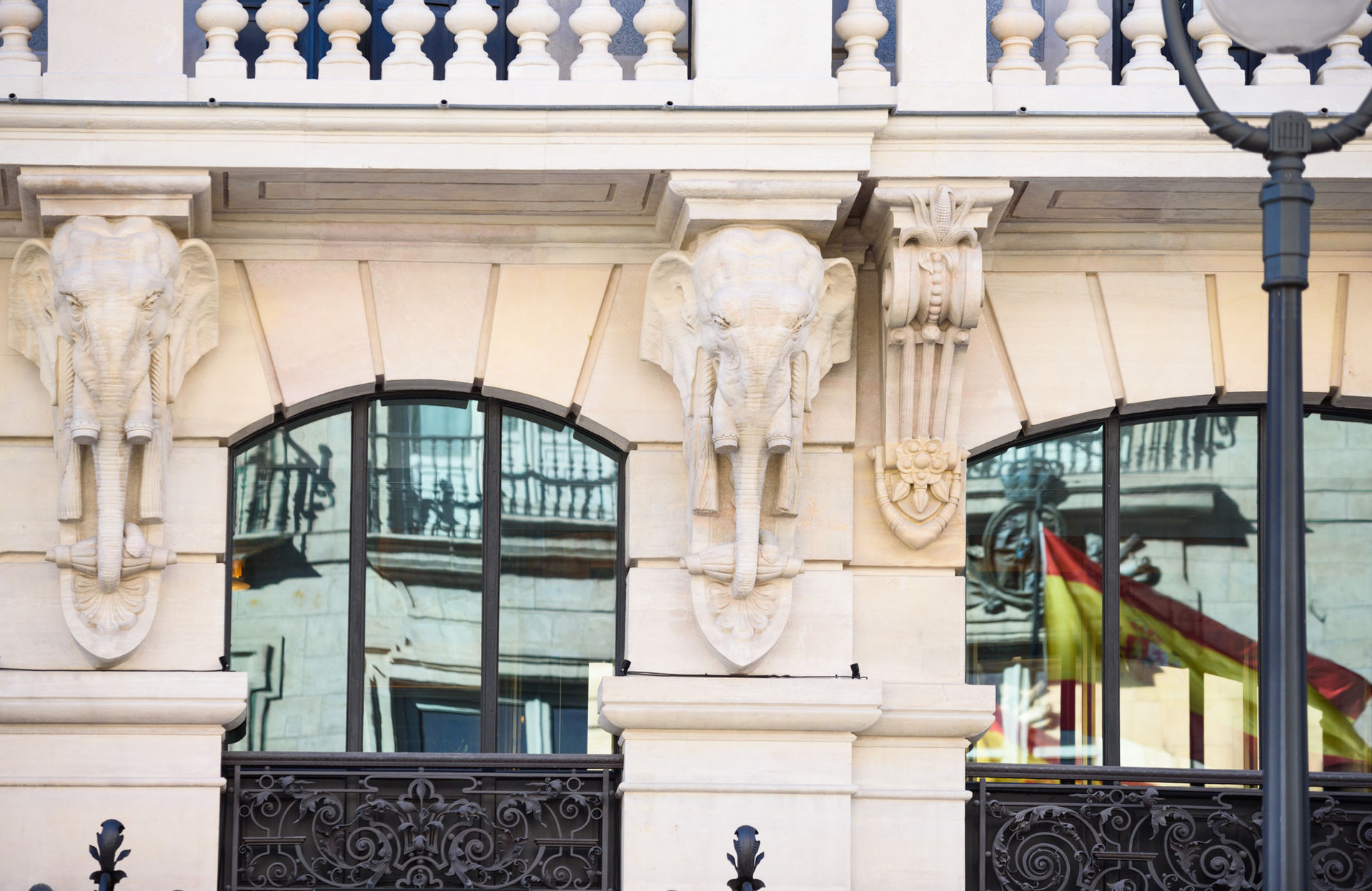 Las cabezas de elefante de la fachada provienen del interés del arquitecto José Grases por los teatros, en especial el parisino Eden-Theatre de los arquitectos franceses Klein y Duclos