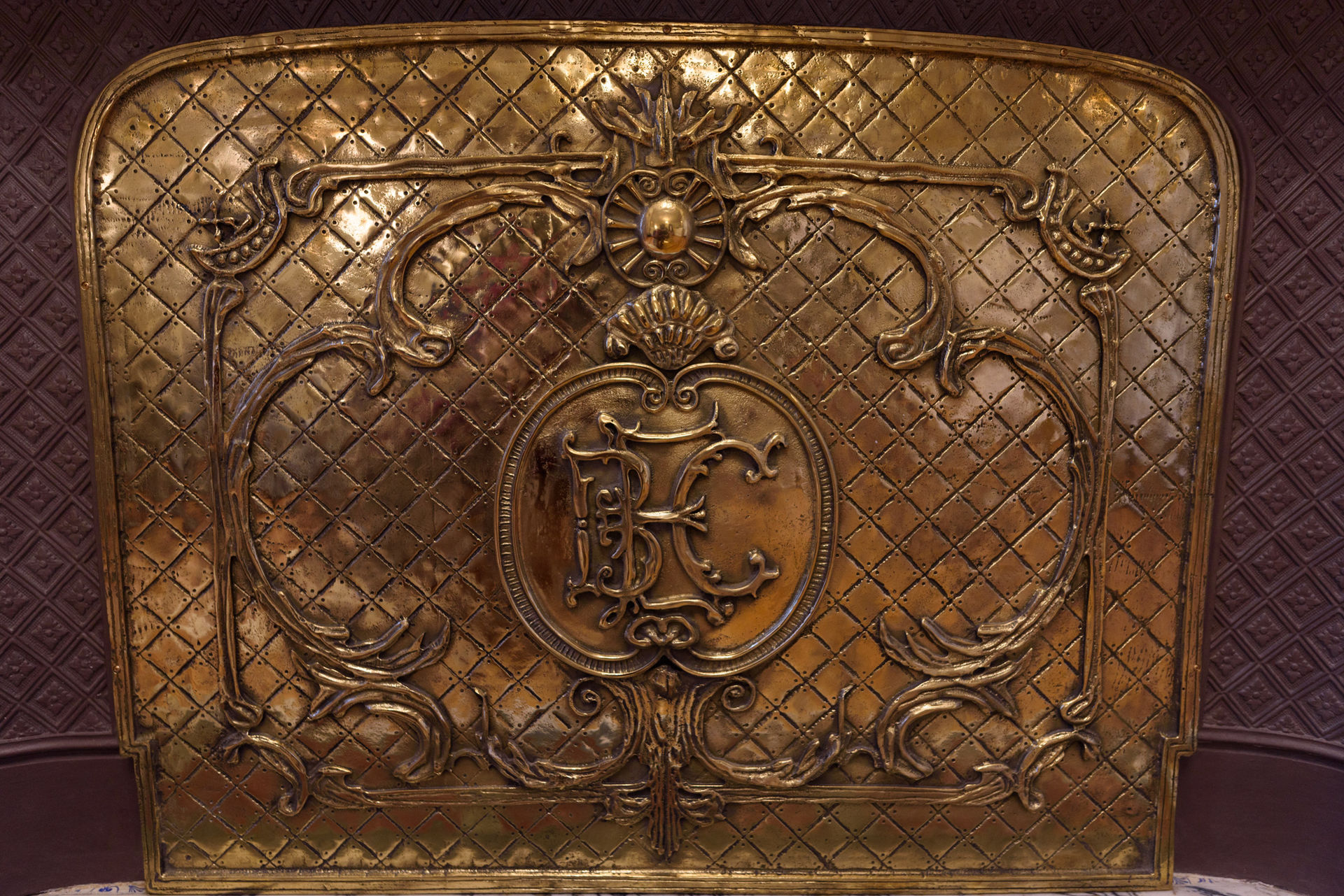 El detalle del logotipo del Banco Español de Crédito en la chimenea de la suite Royal.