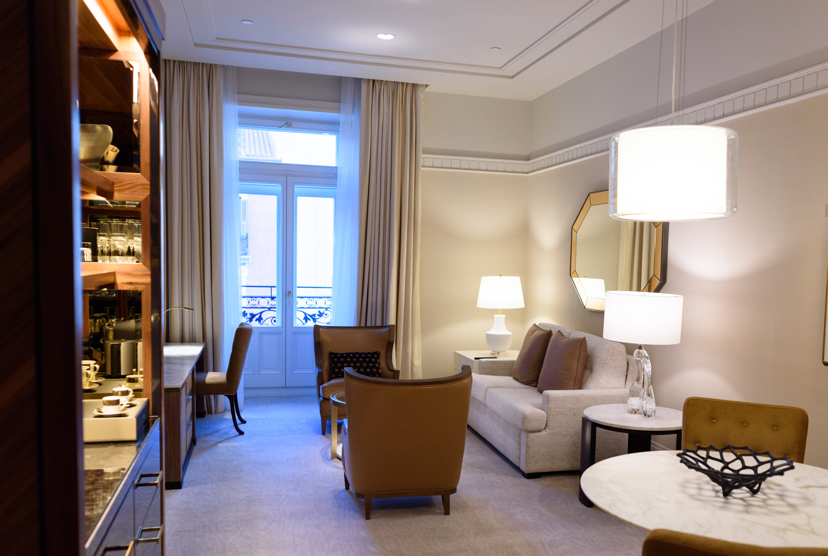 Una imagen de una de las habitaciones con el mueble-bar típico Four Seasons está presente en todas las habitaciones; lacado en negro, y con detalles de cobre y espejos, aportando un claro toque de lujo.