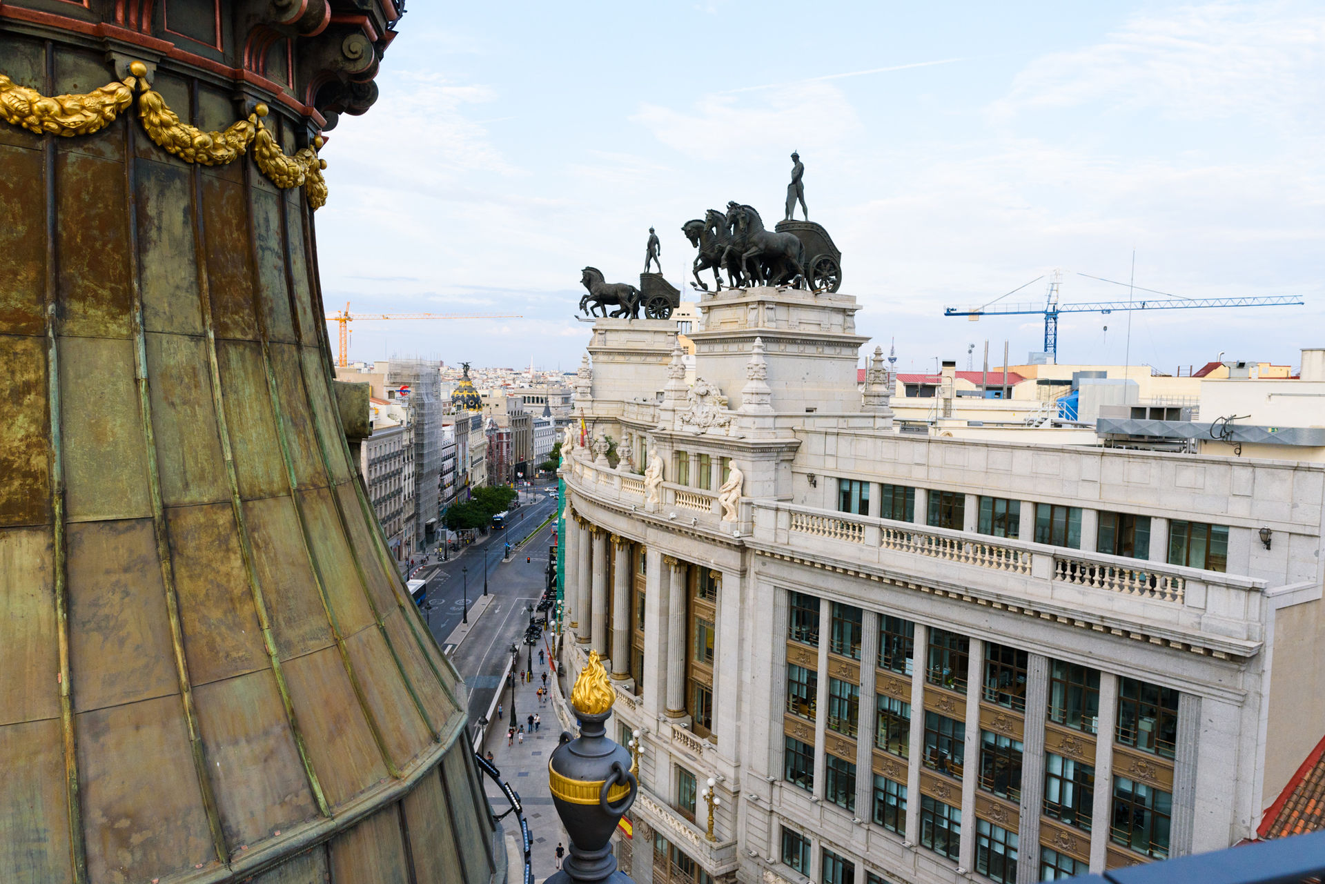 Las vistas de la calle Alcalá con el edificio del antiguo Banco de Bilbao y sus dos cuadrigas en la parte superior.
