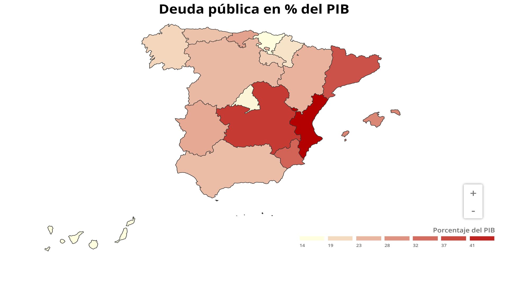 De su lado, la Comunidad de Madrid (15,8%), País Vasco (14,9%) y Canarias (14,6%) son las que menor deuda tienen respecto al PIB.