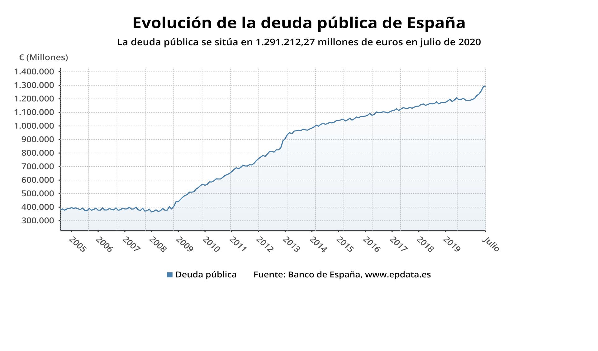 La deuda del conjunto de las administraciones públicas subió en el segundo trimestre hasta el máximo histórico de 1.290.657 millones de euros, alcanzando el 110% del PIB, por lo que aumentó en términos absolutos un 5,4% respecto al trimestre anterior, como consecuencia de la crisis del Covid-19.