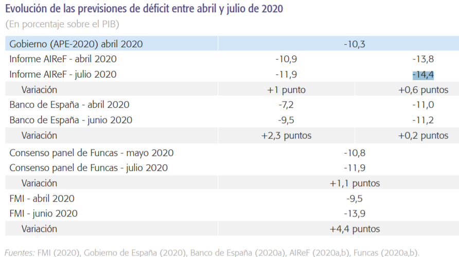 Por un lado, el último panel de Funcas, correspondiente al mes de septiembre, que recopila todos estos cálculos, avanza una caída del PIB del 12% en 2020, mientras que el crecimiento para el próximo año rondaría el 7,3%, un 60% inferior a la contracción experimentada durante el presente ejercicio. Y, por otro, el déficit público podría oscilar entre una horquilla de 133.000 y 161.000 millones de euros, hasta el punto de superar el 14% del PIB, un nuevo récord histórico. A este respecto, cabe recordar que la anterior marca tuvo lugar en 2009, en plena crisis financiera internacional, cuando la diferencia entre ingresos y gastos superó los 120.000 millones, cifra equivalente al 11,3% del PIB.