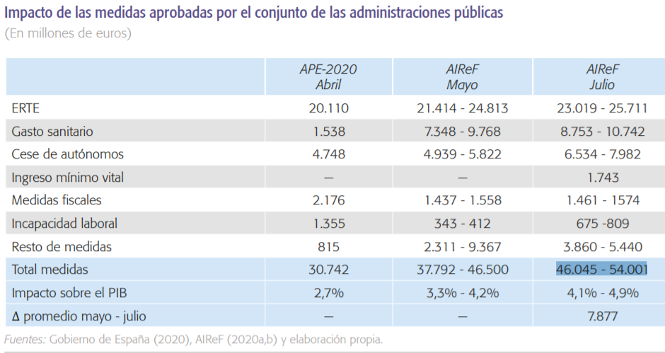 Tan sólo la factura de las medidas que han aprobado las diferentes Administraciones desde el pasado mes de abril ronda el 5% del PIB, unos 50.000 millones de euros, y todo apunta a que seguirá en aumento tras la prolongación de los ERTE más allá de septiembre, el incremento de la prestación por desempleo o el alza de los gastos sanitarios y educativos debido a los rebrotes de coronavirus.