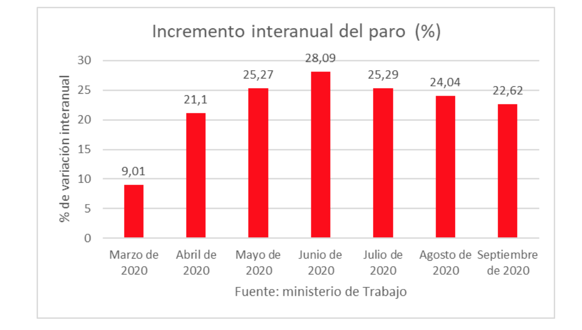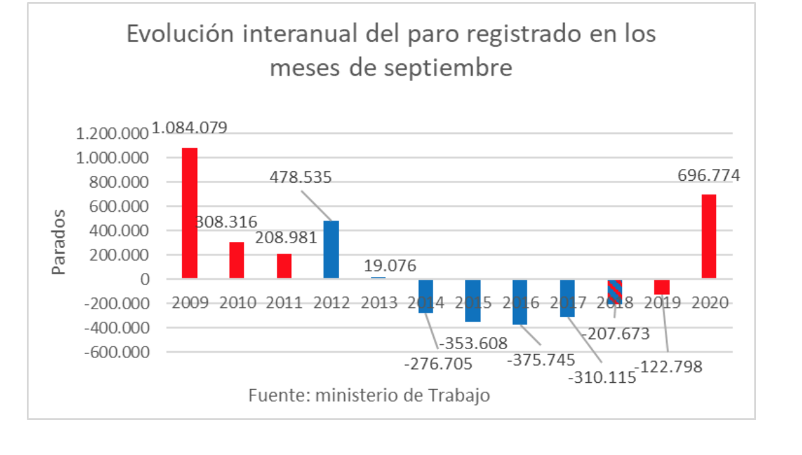 El Gobierno alardea de los datos de paro registrado y de afiliación a la Seguridad Social del mes de septiembre, por sus cifras mensuales, pero si los miramos detenidamente observamos que no es más que un mero espejismo, y que los números muestran la cruda realidad en la que nos encontramos: una crisis sin precedentes, donde registran los peores datos interanuales de paro y afiliación desde la anterior crisis, un hundimiento en la contratación y una intensa destrucción de empresas.