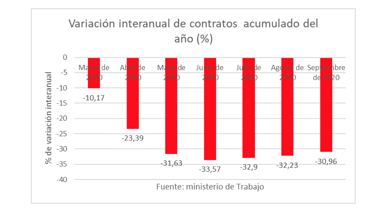 Por edades, el paro juvenil aumenta en 16.657 personas. Bajan los contratos un 22,06% interanual en el mes (462.151 contratos menos). Un 30,96% interanual en los nueve primeros meses del año (5.196.216 contratos menos).