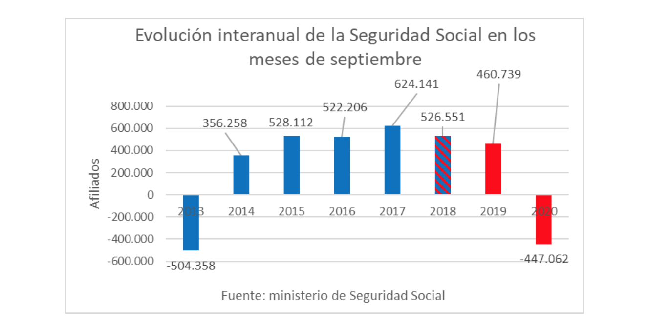 Pero no es más que un mero espejismo estacional, porque en términos interanuales los afiliados disminuyen en 447.062 personas. Es el peor dato interanual de un mes de septiembre desde 2013.