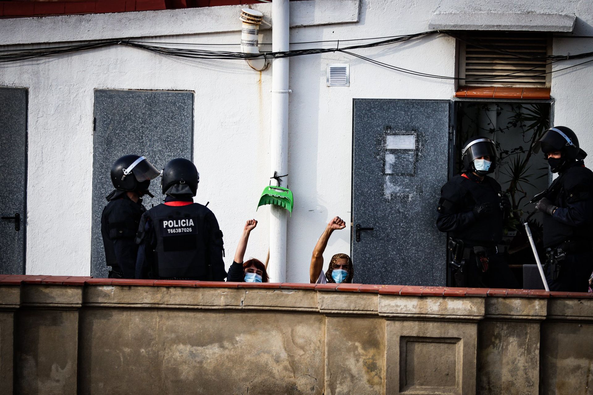 Los agentes fueron recibidos violentamente por centenares de pro-okupas, grupos de extrema izquierda del Sindicato d’Habitatge del Raval, que ya habían montado un dispositivo antidesahucio.