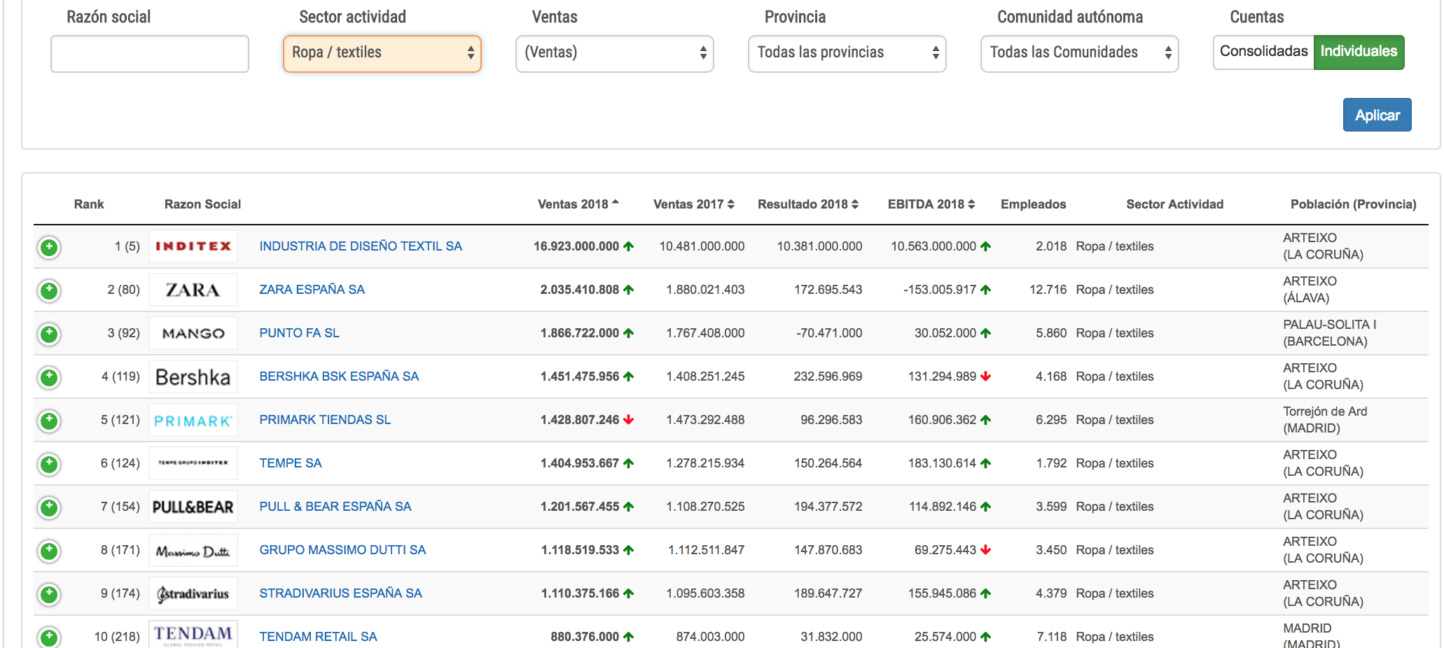 Además, el lector podrá filtrar su búsqueda por sectores de actividad, por ventas, por provincias o por comunidades autónomas. Por ejemplo, ¿le interesa averiguar cuáles son las empresas que más facturan del sector textil? En su sección de rankings podrá hacerlo seleccionando una sencilla pestaña.