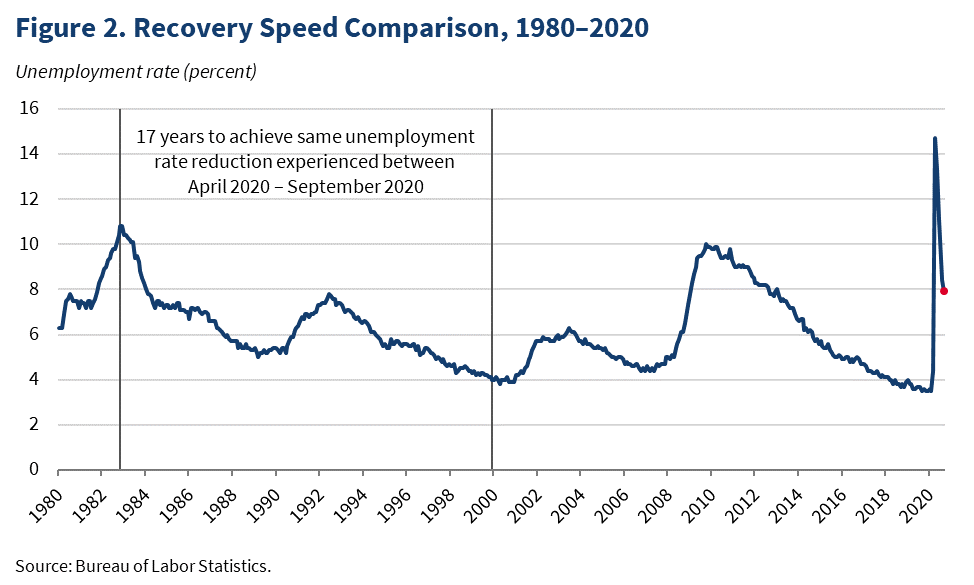 El desempeño del mercado laboral está superando con creces las estimaciones de la mayoría de analistas. La Oficina Presupuestaria del Congreso estimaba que el paro cerraría el año 2020 en el 10,5%, mientras que el consenso de analistas bursátiles y el servicio de estudios de la Reserva Federal coincidían en una proyección del 9,3% para diciembre. Por lo tanto, a falta de un trimestre, los datos de septiembre ya confirman que se ha creado mucho más empleo de lo esperado.