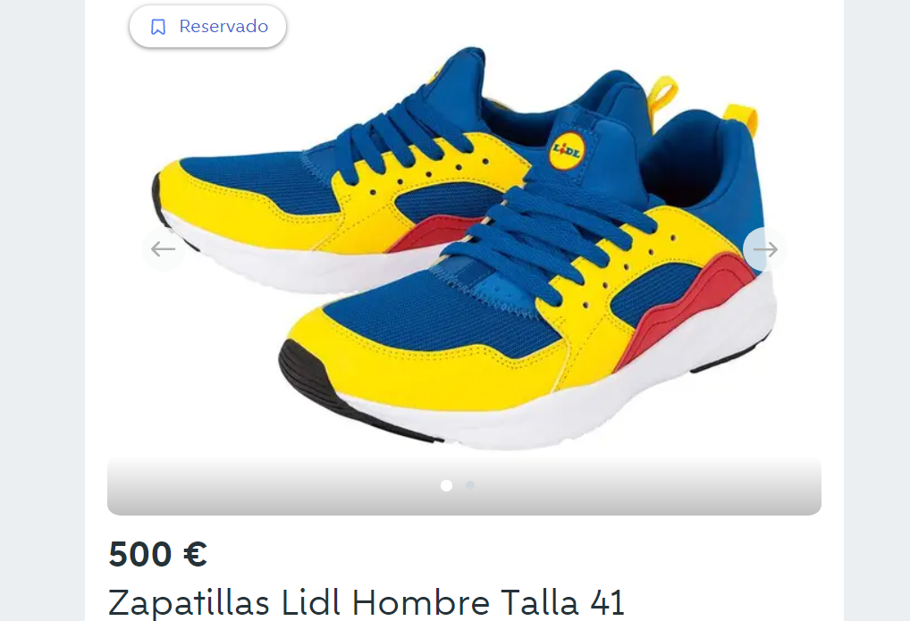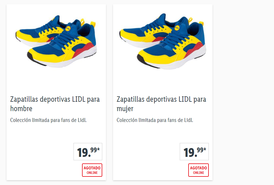 Las zapatillas de la cadena alemana de supermercados Lidl ya están a la venta en España. O mejor dicho, estaban. Las mediáticas sneakers de color azul, rojo y amarillo se lanzaron en otros países de Europa en el mes de julio, dentro de una colección de ropa con sus colores corporativos, y rápidamente se convirtieron en producto súper ventas, hasta el punto de agotarse rápidamente y llegar a revenderse por miles de euros en webs como Ebay.
