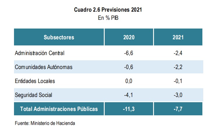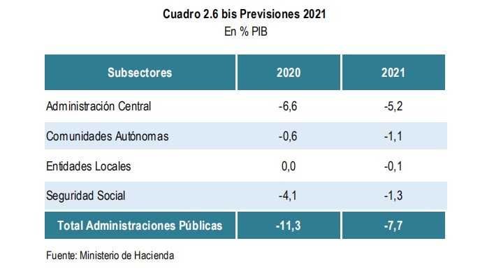 ** Previsión de déficit público para 2020-21 (páginas 34-35): el año que viene, el Gobierno prevé un déficit público equivalente al 7,7% del PIB repartido de la siguiente manera