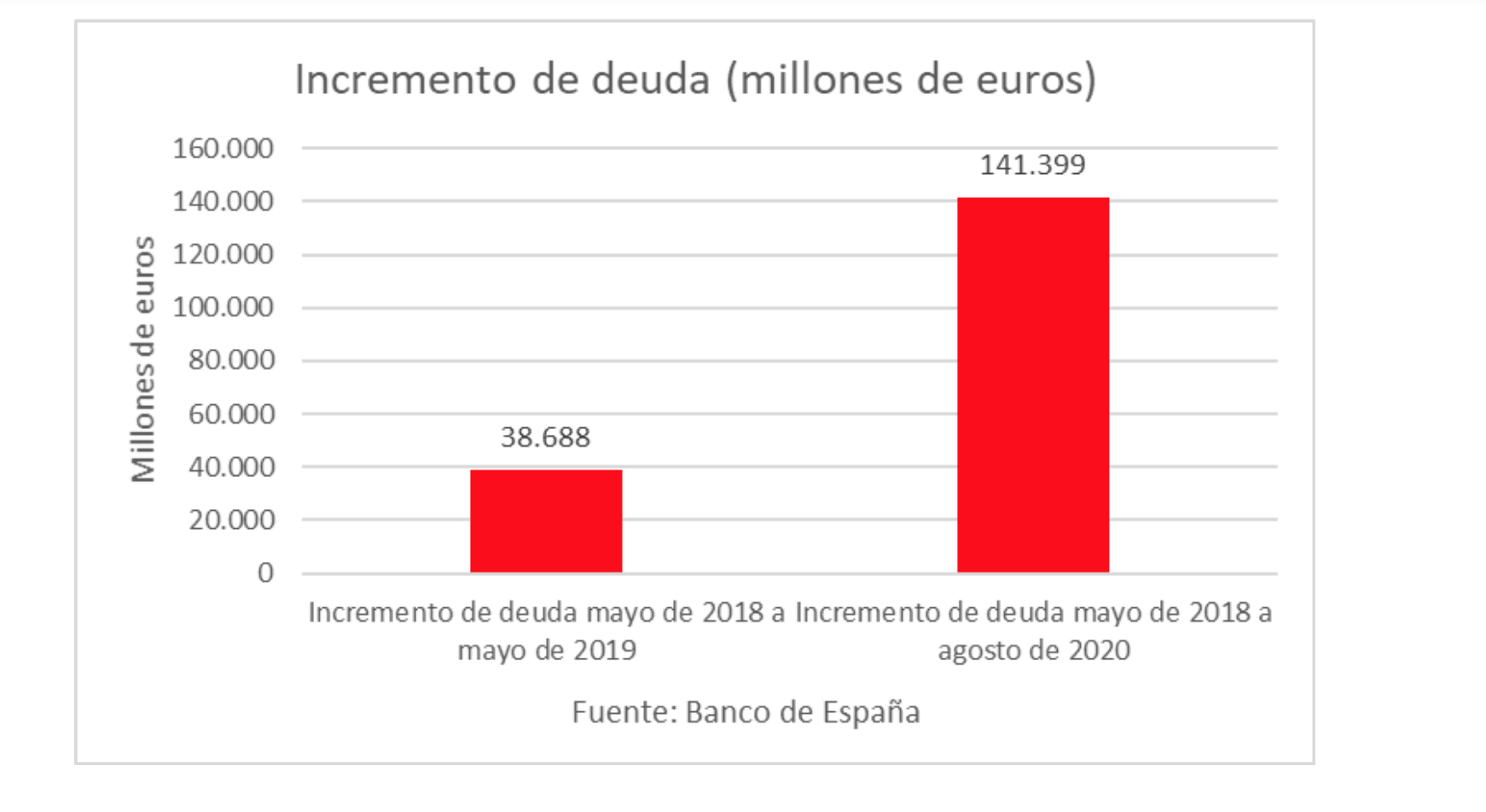 En dicho cociente, ya está comenzando a operar el efecto negativo tanto en el numerador como en el denominador, pues la deuda aumenta en 109.877 millones de euros entre diciembre de 2019 y agosto de 2020 y el PIB se estima que se reduzca en 139.474 millones de euros de 2019 a 2020.