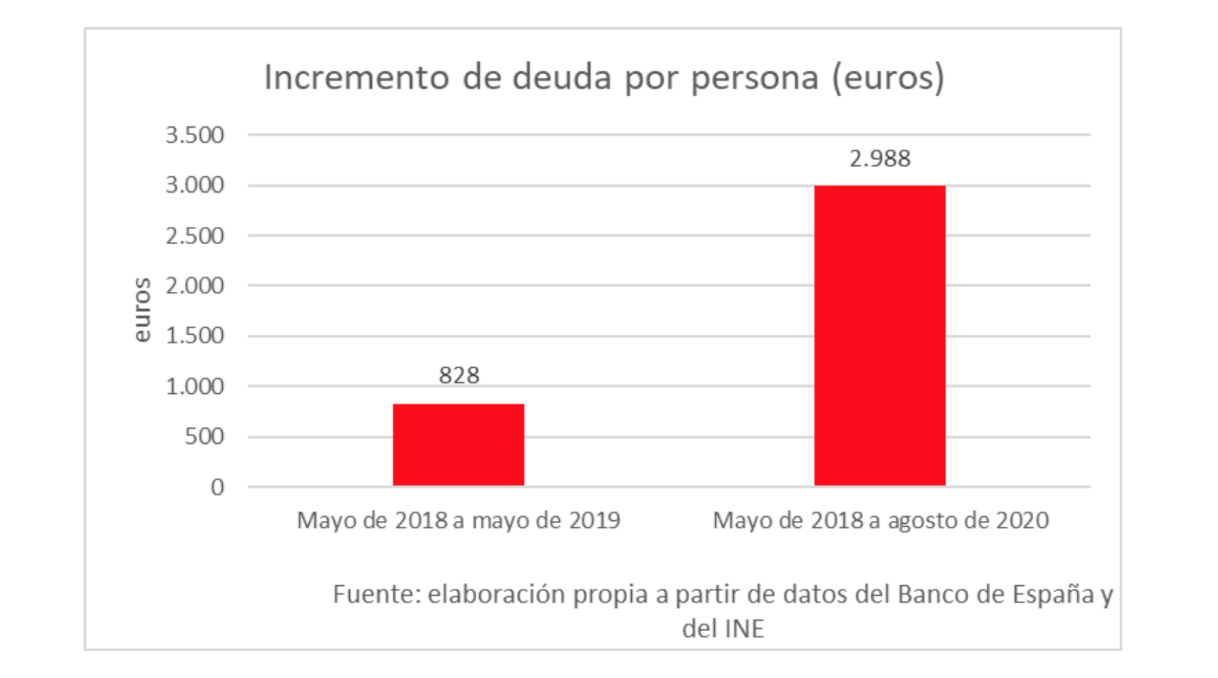Así, si durante el primer año creció la deuda por persona en 828,03 euros, en los más de dos años de mandato de Sánchez la deuda por persona ha aumentado en 2.988 euros, casi tres veces y media el incremento del primer año.