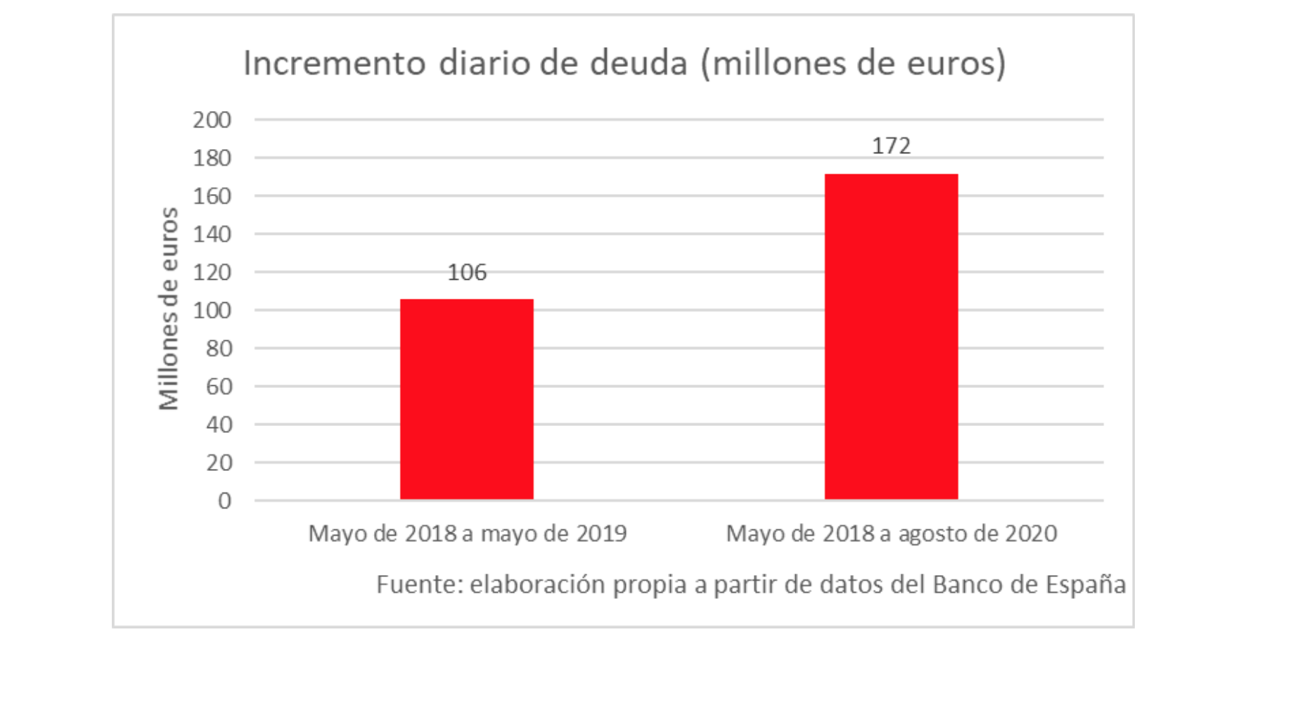 O visto de otra manera: en el primer año, la deuda se incrementaba a un ritmo de 105,99 millones de euros al día. Ahora, tras algo más de dos años de Gobierno de Sánchez, la deuda crece 171,89 millones de euros cada día.