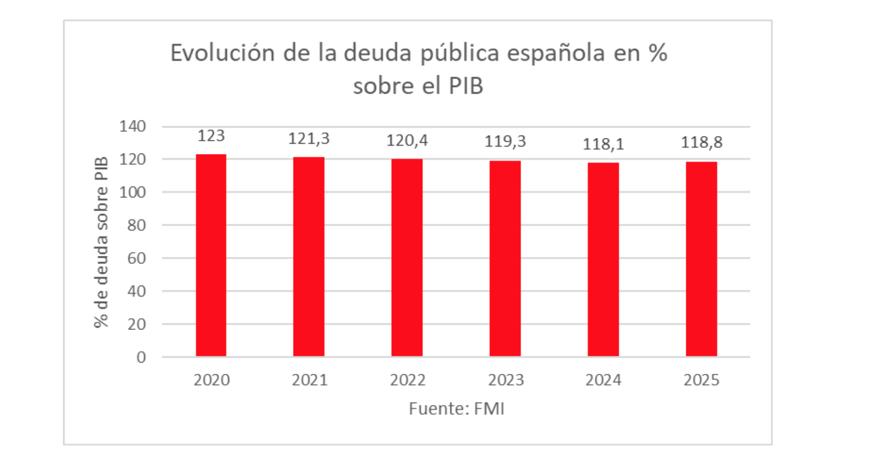 De esa manera, nos encontramos con un incremento exponencial del gasto, una caída en picado de la recaudación y un descenso notable del PIB. Todo ello, hará que la deuda española se sitúe este año entre el 115% y el 125% del PIB, dependiendo de cuál sea la intensidad final del movimiento de déficit y PIB, siendo factible que supere el 130% en 2021. De hecho, el FMI estima que la deuda cerrará 2020 en el 123% del PIB, para quedarse en el 118,8% en 2025, año que, además, subirá de nuevo sobre 2024.