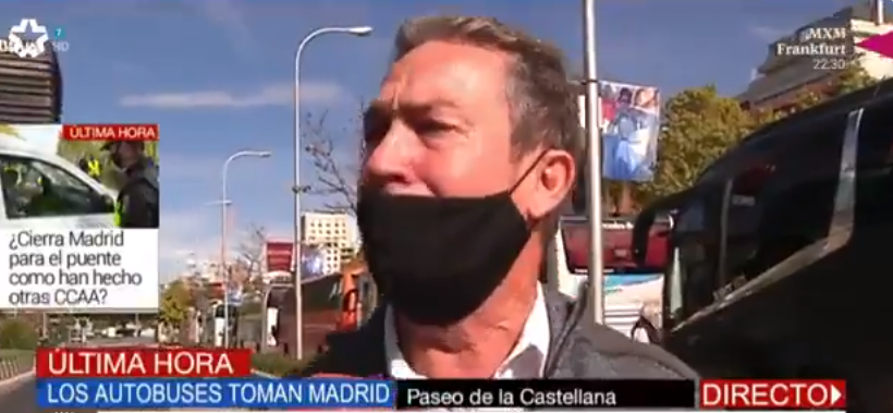 Un conductor de autobús no ha podido contener las lágrimas durante una entrevista en directo en la televisión autonómica de Madrid. El empresario ha roto a llorar cuando ha relatado la situación de quiebra que atraviesa su pequeña flota de autobuses.