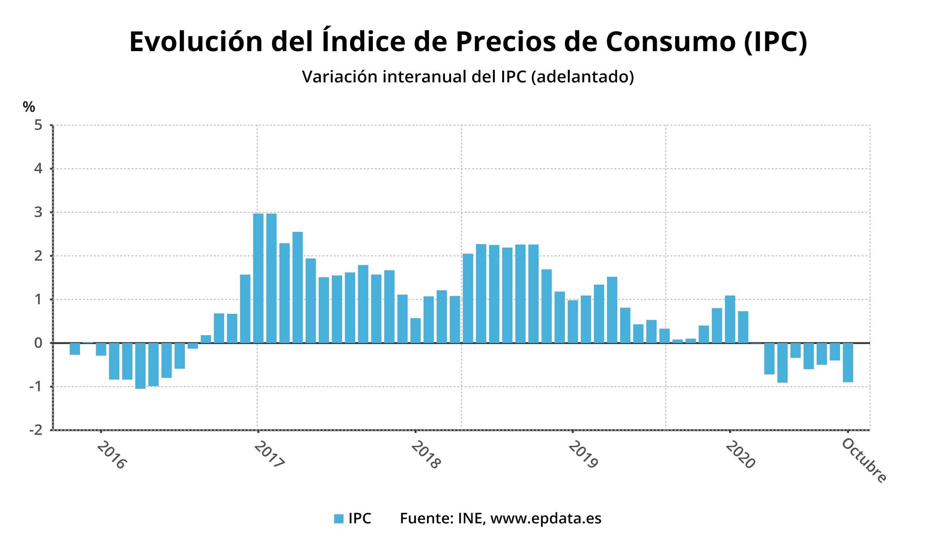 Según el indicador adelantado del IPC publicado este jueves por el Instituto Nacional de Estadística (INE), este dato de octubre supone una disminución de medio punto frente a la tasa de septiembre y encadenar siete meses en negativo desde el estallido de la pandemia.