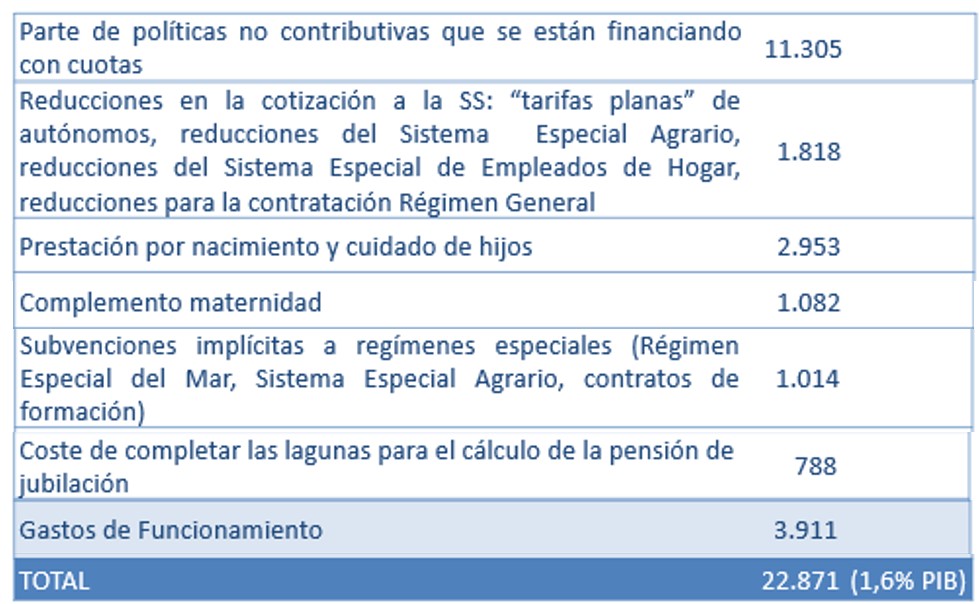 De hecho, en alguna de sus comparecencias ante la Comisión del Pacto de Toledo ha venido a decir que si le quitamos a la Seguridad Social los gastos impropios, relacionados con políticas que no tienen que ver con este organismo (desde las pensiones no contributivas a las bonificaciones a la contratación), el sistema estaría más o menos en equilibrio.