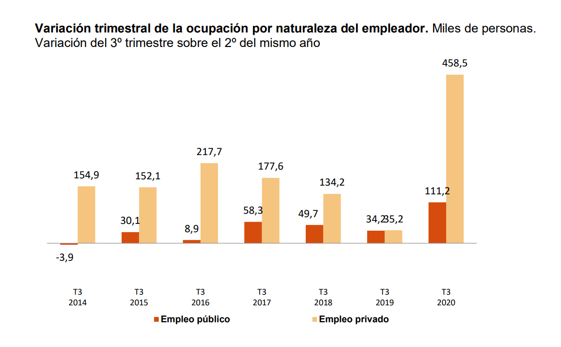 Según los últimos datos de empleo publicados por el INE, España ha marcado un nuevo récord de empleo público: 3.337.000 asalariados en plena pandemia, con una incorporación neta de casi medio millón de trabajadores públicos en el tercer trimestre del año. En comparación con el año pasado, esto supone un incremento del 3,36%, en un momento en el que el empleo privado se ha desplomado un 4,84%. Todo esto hace que, en estos momentos, casi el 21% de asalariados dependan de una nómina estatal