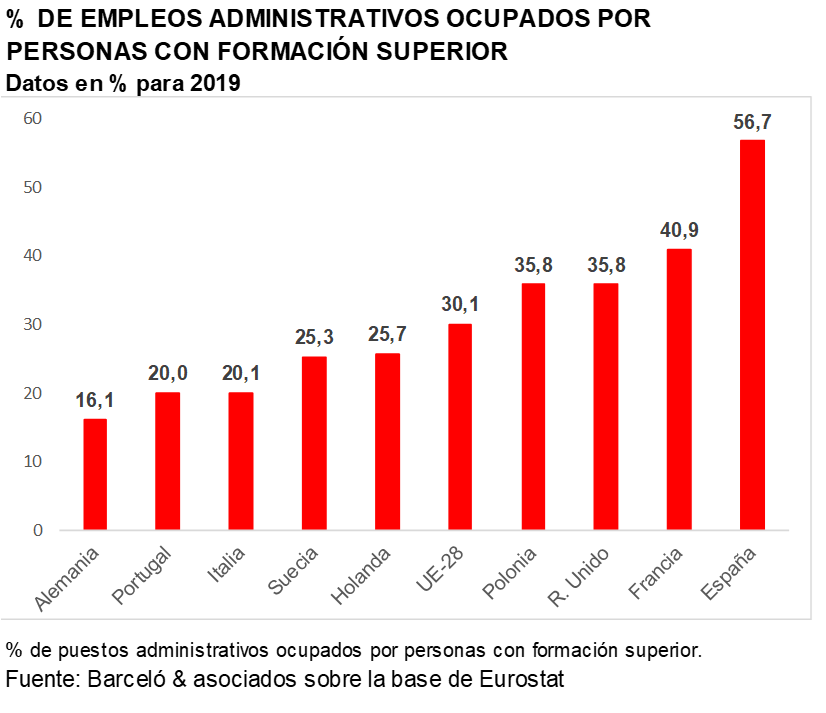 En igual sentido, España es donde una mayor proporción de las tareas administrativas son desempeñadas por personas con formación universitaria (56,7%; casi el doble que la media de la UE, de 30,1%). Además, nuestro país es el tercero con una mayor proporción de ocupaciones elementales que es desarrollada por gente con educación terciaria. Mientras en España esta relación es de 3,1%, la media de la UE es 1,7%. En diez países comunitarios es inferior al 1%.
