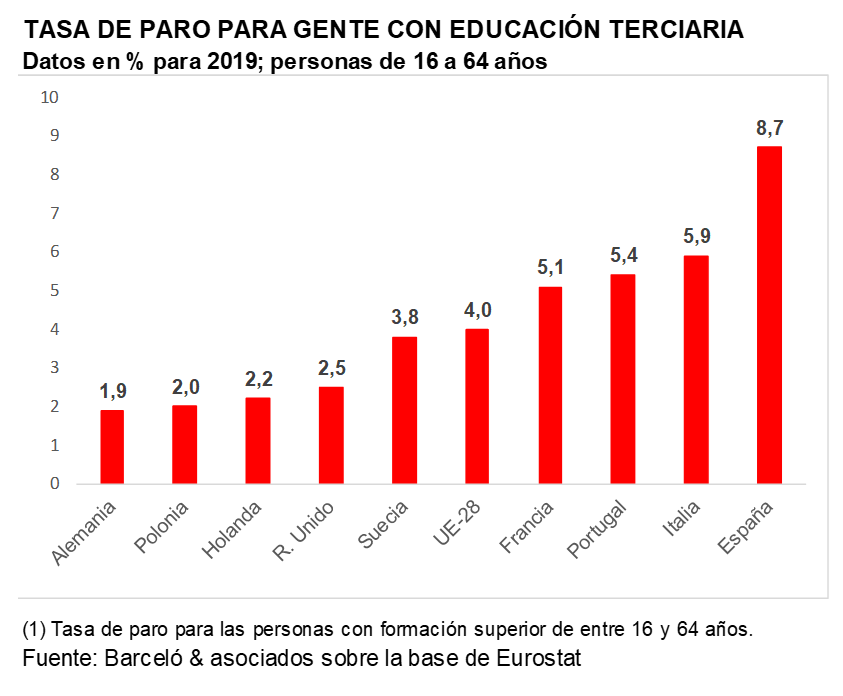 En 2019, España tuvo la segunda mayor tasa de paro de la UE para las personas con educación superior (8,7%). Aunque no es algo exclusivo de dicho grupo (la tasa de paro total española también fue la segunda mayor), contrasta con otros 14 países comunitarios, donde la gente con estudios terciarios goza de pleno empleo (paro de 3% o menos). La media de la UE fue de 4%.