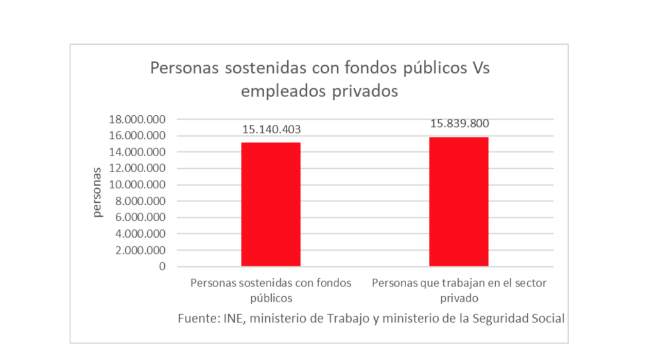 El lugar al que nos llevan estos datos es a que la economía avanza inexorablemente hacia la conversión en una economía subsidiada, clientelar e insostenible. Así, frente a los 15.839.800 ocupados que hay en el sector privado, nos encontramos con que esa cifra de trabajadores sostiene a un número similar de personas pagadas con fondos públicos, que son 15.140.403. Eso es, sencillamente, insostenible en el tiempo.