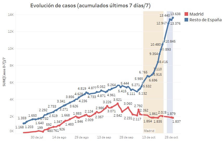 Mientras el gobierno preparaba la intervención de Madrid con la declaración del Estado de Alarma, nuestros lectores ya sabían que Madrid reducía sus contagios en términos netos, de modo que ya no solo estábamos ante un cambio de tendencia que venía de dos semanas atrás, sino también ante un punto de inflexión que ya se reflejaba en las cifras absolutas de incidencia.
