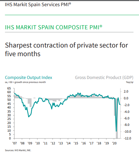 Mientras tanto, Europa muestra cada vez más indicadores que avanzan hacia un cambio de tendencia a la baja, y España, desafortunadamente, se sitúa a la cabeza. Los datos del mes de octubre muestran la peor contracción económica desde que finalizó el confinamiento. Por poner esta caída en perspectiva: Estamos en niveles similares a los de la crisis de 2011 y 2012, y con una evolución negativa que no tiene visos de cambiar.