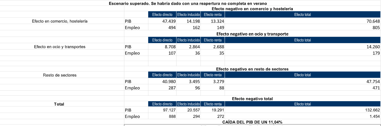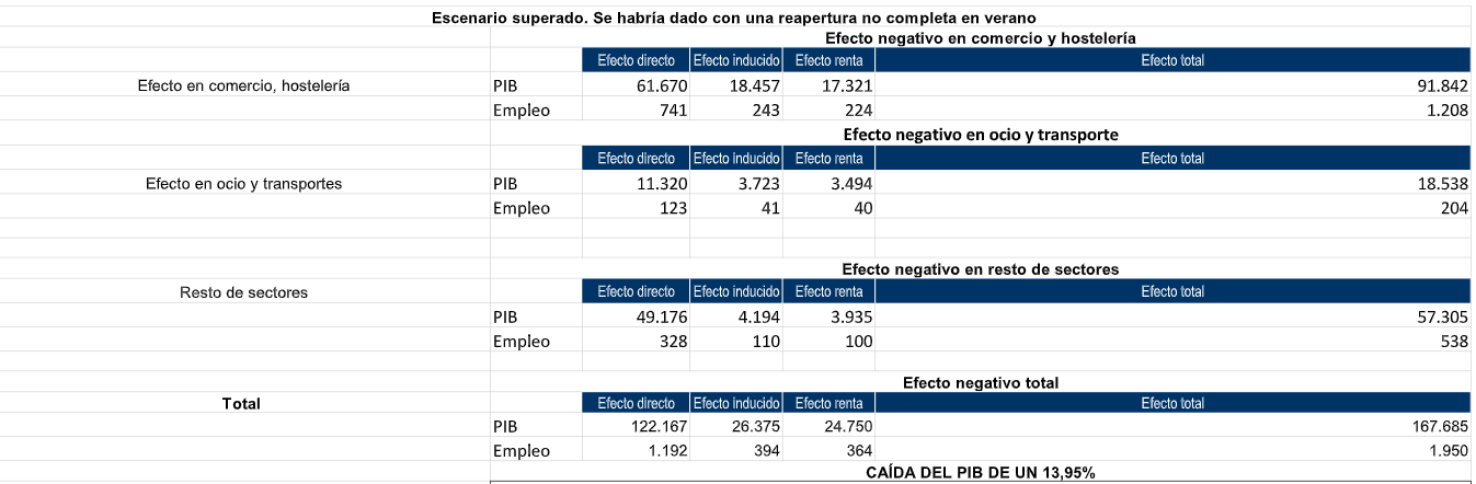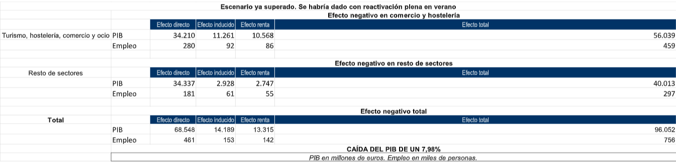 Ya es inalcanzable el escenario que se habría derivado de aprender de los errores del cierre productivo y haber recuperado la normalidad en el verano. Eso habría limitado la caída del PIB al 7,98%, que ya es muchísimo, pero se podría haber mitigado. El empleo perdido se habría quedado en 756.000 personas.